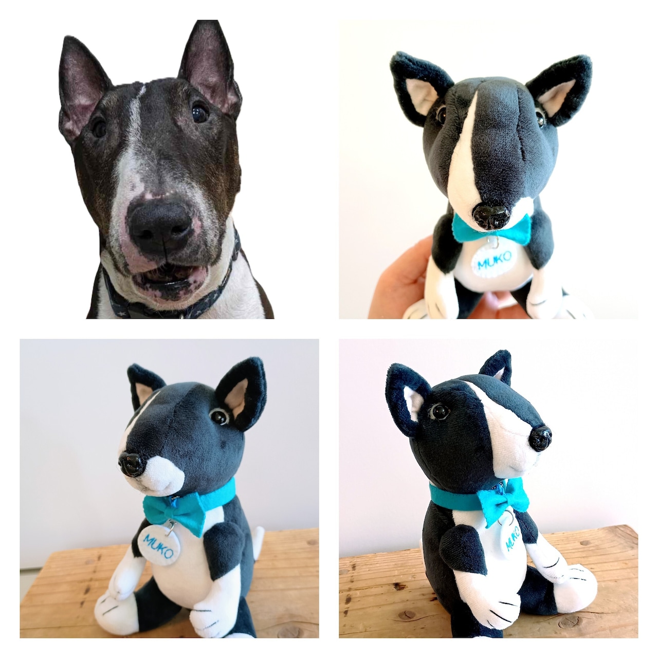 ①ご希望の形とサイズ(立体的なコ13cm,18cm、平たいコ15cm,18cm、マスコット8cm,10cm)、②写真1枚(どんなショットでも構いません)、③犬種を明記ください。